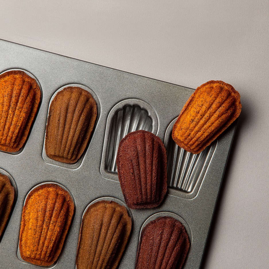 「可可瑪德蓮」使用法國歌劇Opera頂級無糖可可粉與水滴黑巧克力,香氣滿溢、輕盈不膩口;